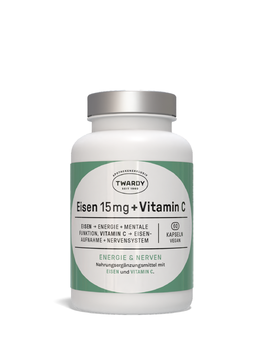 Eisen ist essenziell für die Blutbildung und die Energieversorgung unseres Körpers. In Kombination mit Vitamin C, das die Eisenaufnahme verbessert, bieten die Eisen + Vitamin C Kapseln von Astrid Twardy eine ideale Unterstützung bei erhöhtem Bedarf – etwa bei vegetarischer oder veganer Ernährung, in der Schwangerschaft oder bei Eisenmangel. Jede vegane Kapsel enthält 40 mg Eisen plus Vitamin C für eine bessere Verwertung – für mehr Energie, Konzentration und Wohlbefinden.