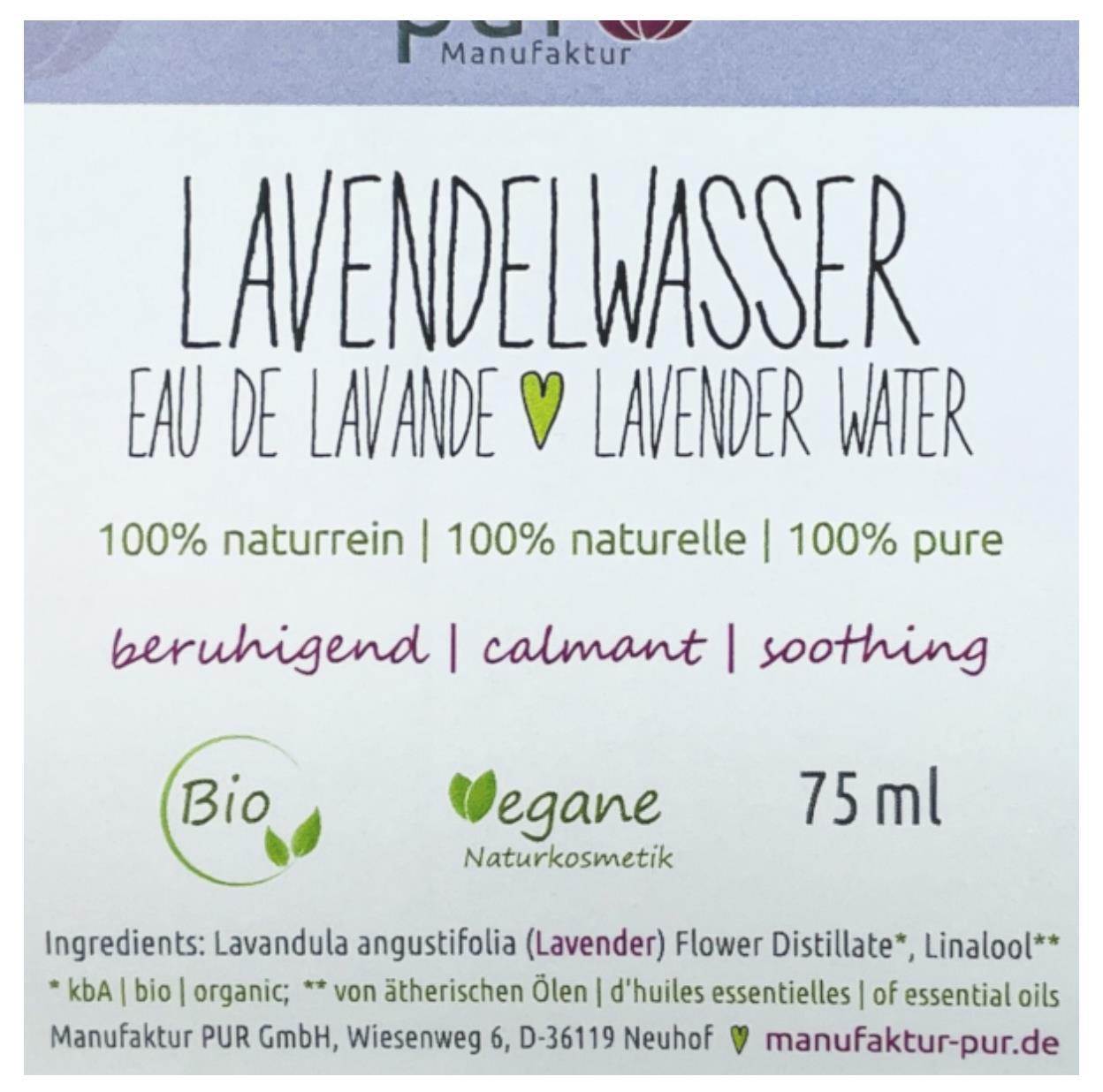 | Zutatenverzeichnis | Lavandula angustifolia (Lavender) Flower Distillate*, Linalool**. *kba,bio, organic. **von ätherischen Ölen |